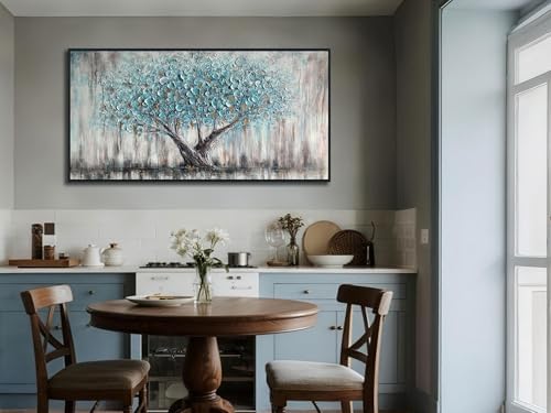 Blue tree wall art size: 40inx20in(100x50cm) including black outer wood frame, hook mounted ready to hang. Canvas prints with 50% hand-paint to make it 3D. The vibrant colors and intricate details of this piece will bring a sense of tranquility and peace to any room Textured tree of life wall art: wall decoration for living room, bedroom, bathroom, dining room, over fireplace, kitchen, mens room, home, office, master bedroom, porch, waiting room, bar, hotel etc Gifts ideas for Christmas, New Year, Wedding, Birthday, Anniversary, Thanksgiving Day, Mother’s Day, Father’s Day, Valentine, friends, relatives, business partner, family, lovers etc Framed Wall Art Feature: high definition canvas prints on canvas, canvas material is waterproof, UV-resistant, color fading-resistant for years This elegant painting features a vibrant array of colors to bring a touch of sophistication, which not only adds visual interest but also a tactile experience to your living and working space See more product details
