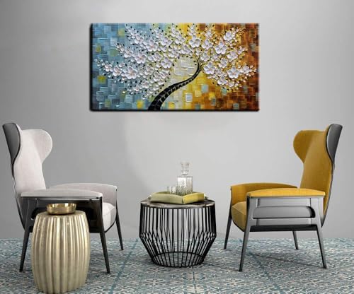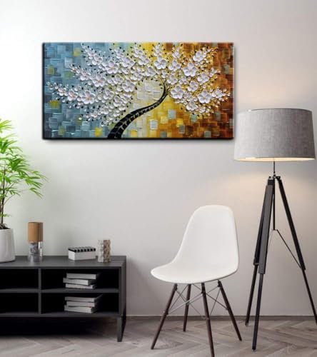 YaSheng Art-Handmade White Flower Contemporary Art Oil Painting On Canvas 3D Texture Abstract Tree Paintings Modern Home Bedroom, Dining Room, Wall Art Decor Ready to Hang20x40inch